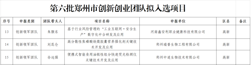 经过区县(市)的立项推荐、技术评审、实地核查以及会议研究等一系列程序,该项目已确定入选第六批郑州市创新创业团队项目,并在郑州市科技局网站上进行了公示。